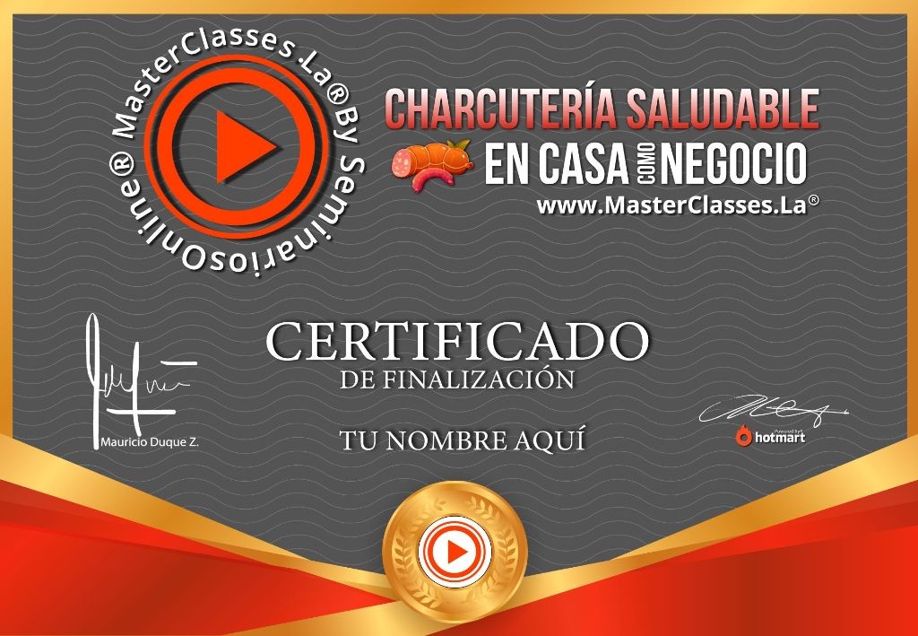 ¡Descubre el MasterClass CHARCUTERÍA SALUDABLE EN CASA COMO NEGOCIO y emprende tu propio negocio de forma saludable! Aprenderás técnicas sencillas para elaborar productos de charcutería sin procesos químicos que afecten tu salud. Dominarás la charcutería artesanal, aprenderás fórmulas de condimento, cocción, salmuera, amasado, cortes, molienda y ahumado, y conocerás técnicas caseras de moldeo. Sorprende a tu familia y amigos con deliciosos productos artesanales saludables y mejora tus ingresos comercializándolos. Además, obtendrás un certificado avalado por Hotmart y Seminarios Online. ¡No te lo pierdas!
