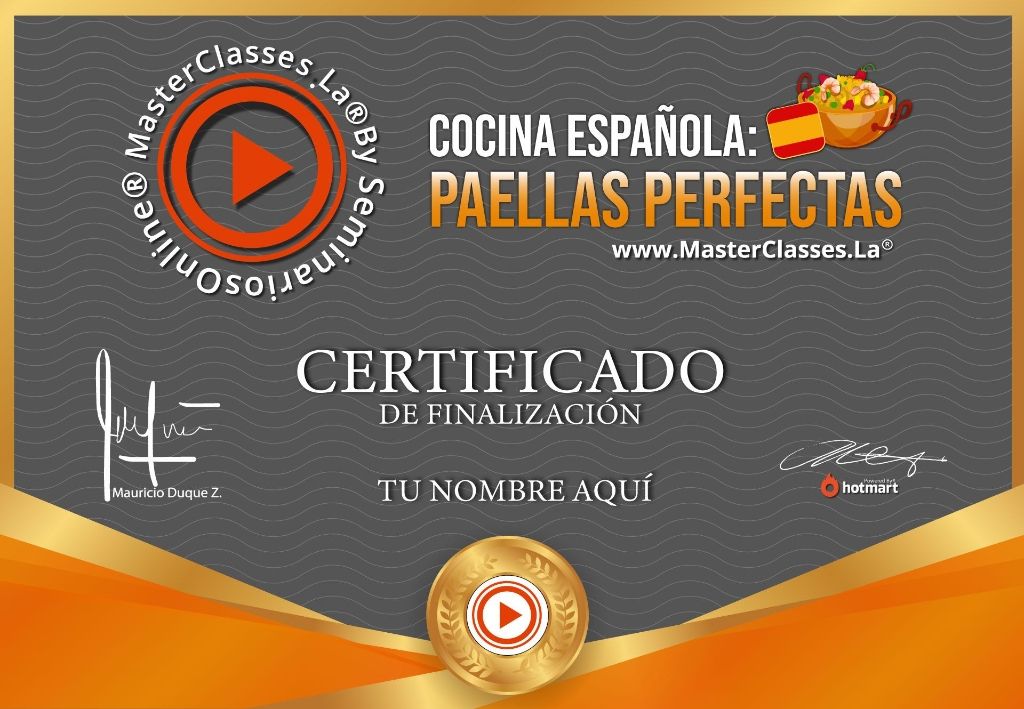 ¿Quieres hacer el arroz perfecto en paella sin complicaciones? Con la Masterclass COCINA ESPAÑOLA: PAELLAS PERFECTAS, aprenderás todos los secretos y técnicas comprobadas para lograrlo. No importa si eres cocinero o no, este curso te enseñará a hacer arroces secos perfectos, caldos y sofritos deliciosos. Desarrollarás tus habilidades culinarias en la cocina española y aprenderás a distinguir la calidad de los arroces. Además, recibirás bonos adicionales y obtendrás un certificado avalado por Hotmart y Seminarios Online. ¡Sorprende a tus seres queridos con deliciosas paellas perfectas!