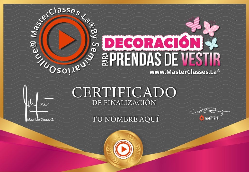 ¿Quieres aprender a decorar prendas de vestir como toda una profesional y desarrollar tu propio negocio desde casa? Con el MASTER CLASS DECORACION DE PRENDAS DE VESTIR COMO NEGOCIO, aprenderás paso a paso diferentes técnicas de bordado y trabajo sobre tela para decorar cualquier tipo de prenda. Aprenderás a diseñar, crear moldes, apliques y trabajar con diferentes materiales. Además, conocerás técnicas de pintura sobre tela, escarcha, bordados con mostacilla y lentejuelas, entre otros. Este curso te enseñará cómo manejar tus costos y te otorgará un certificado avalado por Hotmart y Seminarios Online. ¡No pierdas la oportunidad de convertirte en una experta en decoración de prendas de vestir!