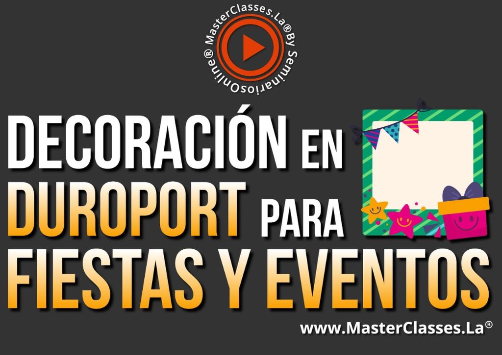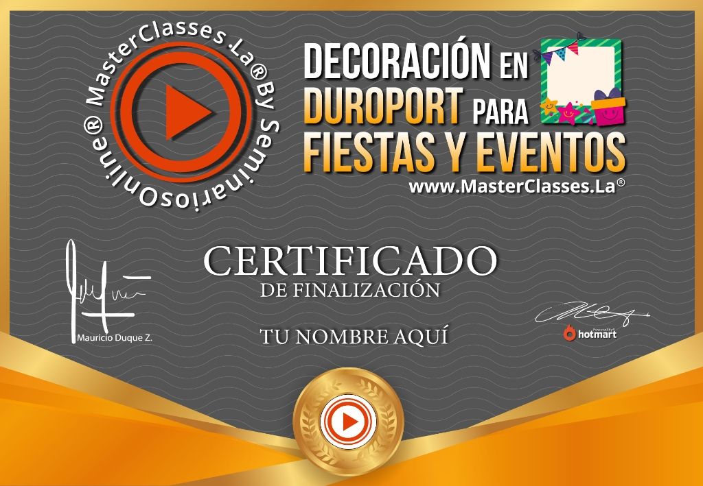 ¿Quieres convertirte en un diseñador y decorador profesional utilizando el durport? Aprende las bases fundamentales y convierte este arte en un negocio rentable con el Master Class Decoración en Durport para Fiestas y Eventos. Aprenderás el proceso paso a paso, adquirirás técnicas y habilidades para hacer creaciones impactantes, y aprenderás a vender tus creaciones con los 3 modelos de negocio del sector. Obtén el certificado avalado por Hotmart y Seminarios Online. ¡No pierdas la oportunidad de emprender en el mundo de las decoraciones!