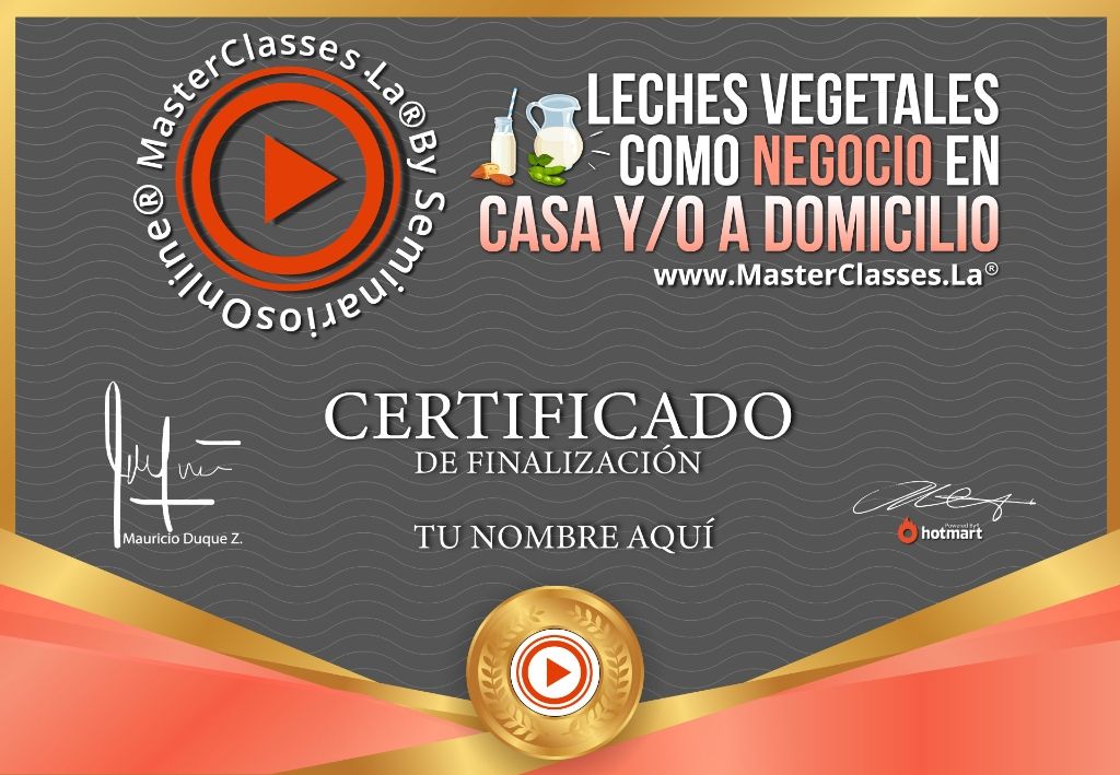 ¿Sabías que puedes aprender a crear, preparar y comercializar leches vegetales desde tu casa y tener un negocio altamente rentable? Con el MasterClass “Leches Vegetales como Negocio en Casa y/o a Domicilio” podrás lograrlo. Aprenderás por qué es importante el consumo de estas leches y cómo se convierten en la mejor alternativa para reducir el consumo de leche animal. Además, tendrás la oportunidad de emprender en esta industria en rápido crecimiento a nivel mundial. No pierdas la oportunidad de escalar un negocio rentable de Leches Vegetales o incorporarlo en tu propia vida y la de tu familia. ¡Obtén tu certificado avalado por Hotmart y Seminarios Online!